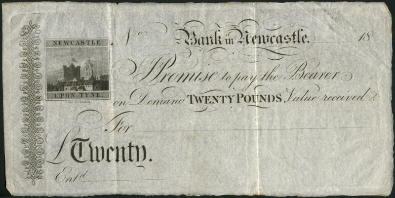 Bank in Newcastle (no partnership names), part issued £5, 1 May 1840, serial number B 1867, also an unissued £20, both black and white, view of the city in square frame top left, also a sight bill dated 29 January 1829