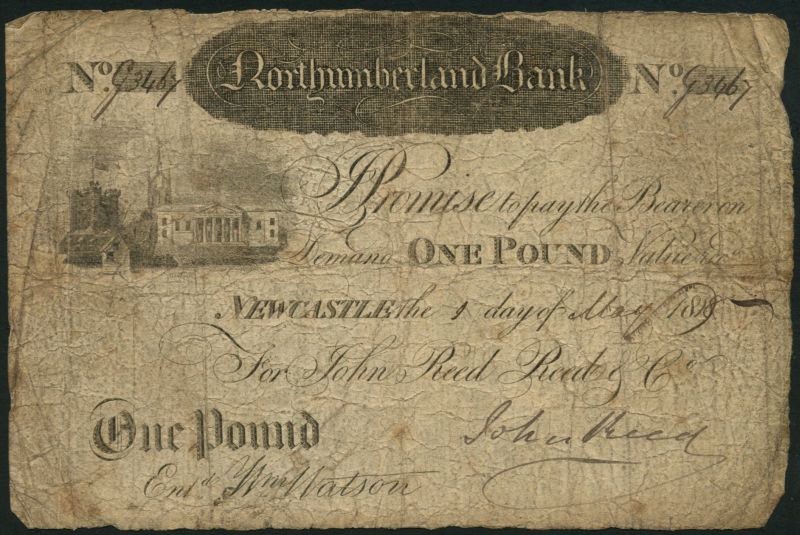 Northumberland Bank (John reed,Reed & Co.), £1, 1 May 1818, serial number G 3467, black and white, buildings top left, manuscript signature of John reed low right