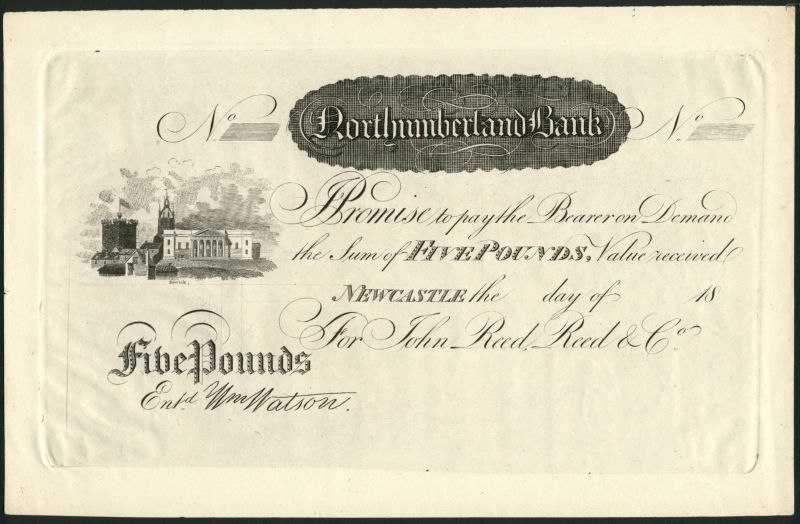 Northumberland Bank (John reed,Reed & Co.), proof £5, 18- (ca 1810), two later proof pulls, black and white, buildings top left