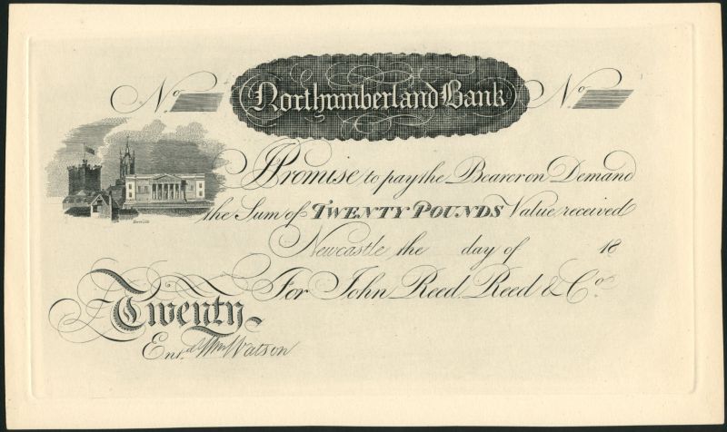 Northumberland Bank (John reed,Reed & Co.), later proof pull £20, 18- (ca 1810), black and white, buildings top left