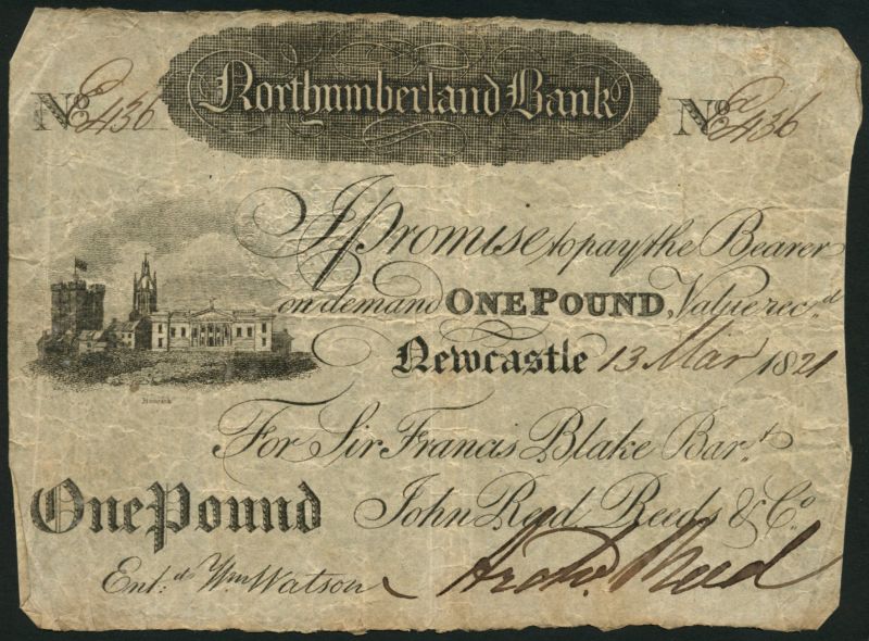 Northumberland Bank (Sir Francis Blake,John Reed,Reeds & Co.), £1, Newcastle, 13 March 1821, serial number E436, black and white, buildings top left, manuscript signature of Archibold Reed low right