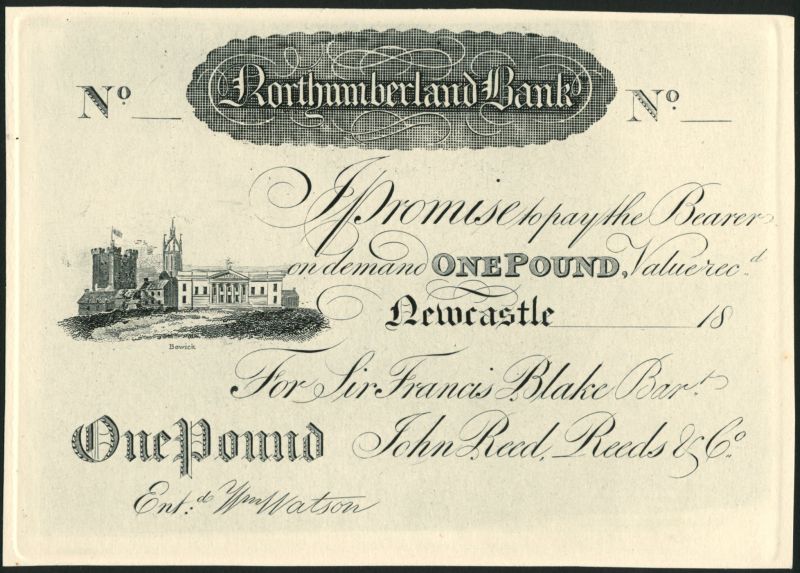Northumberland Bank (Sir Francis Blake,John Reed,Reeds & Co.), later proof pull £1, Newcastle, 18- (ca 1820), black and white, buildings top left, also proof pill £5 (2), as previous
