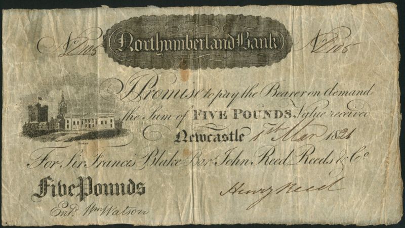 Northumberland Bank (Sir Francis Blake,John Reed,Reeds & Co.), £5, Newcastle, 1 March 1821, serial number D 105, black and white, buildings top left, manuscript signature of Henry Reed low right