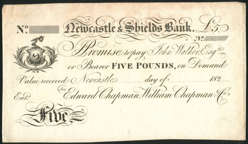 Newcastle & Shields Bank (Chapman, Chapman & Co.), proof £5, Newcastle, 182-, black and white, arms within wreath top left