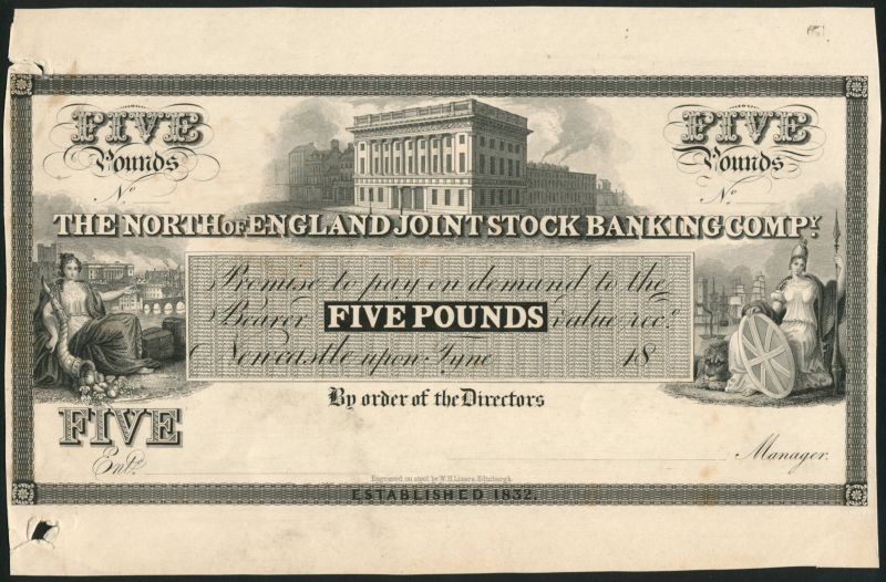 North of England Joint Stock Banking Compy., proof £5, Newcastle upon Tyne, 18- (1832-1847), black and white, bank building top centre, maiden with cornucopia at left, Britannia at right