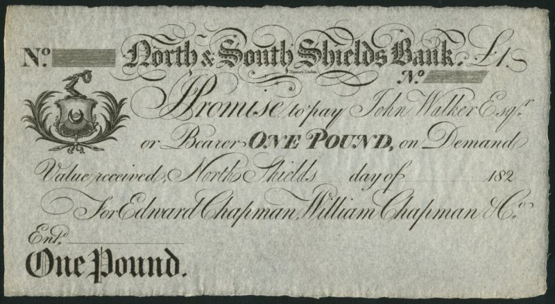 North & South Shields Bank (Edward Chapman, William Chapman & Co.) unissued £1, 182-, black and white, arms top left