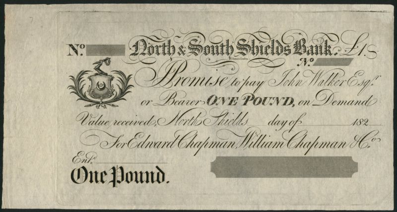 North & South Shields Bank (Edward Chapman, William Chapman & Co.) unissued £1, 182-, black and white, arms top left, blank black tablet low right