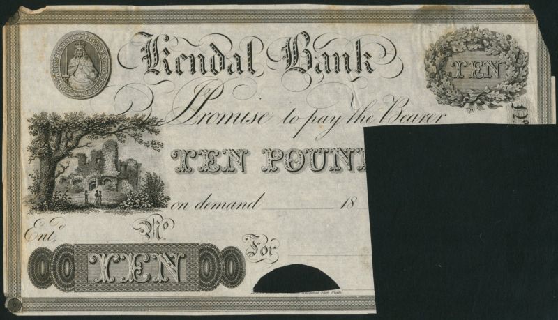 Kendal Bank, proof £10, 18-, black and white, ruins and seal of the town of Kendal at left, value within oak wreath top right