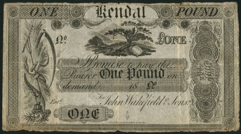 Kendal Bank John Wakefield & Sons), unissued £1, 18-, black and white, symbols of agriculture at left, plough and tree top centre, partners initial in oval frame at right
