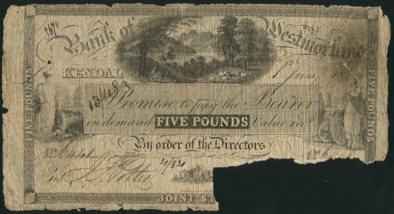 Bank of Westmoreland, £5, 1 January 1831, serial number 6441, black and white, pastoral view top centre, maiden with cornucopia at left, Britannia at right