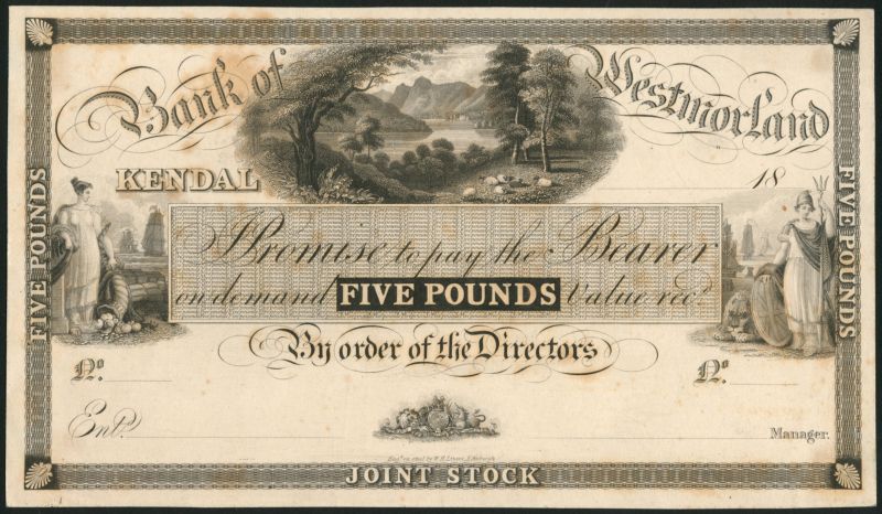 Bank of Westmoreland, proof £5 on card, 18-, black and white, pastoral view top centre, maiden with cornucopia at left, Britannia at right