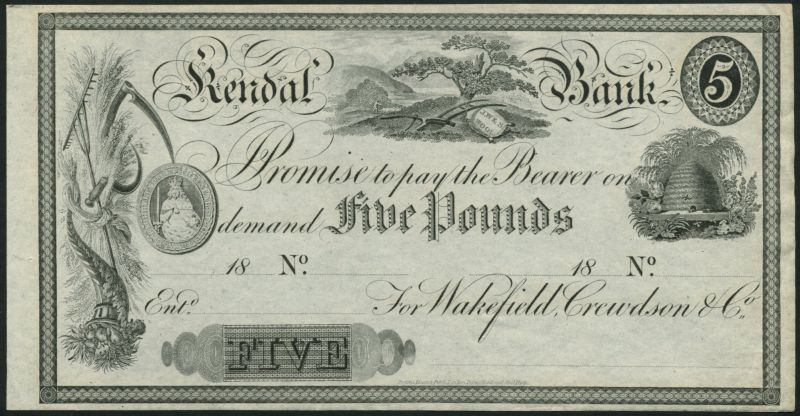 Kendal Bank (Wakefield, Crewdson & Co.), proof £5 (2), 18-, black and white, agricultural symbols at left, plough and tree top top centre, seal of the Town of Kendal at left, beehive (Industry) at right
