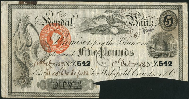 Kendal Bank (Wakefield, Crewdson & Co.), £5 , 1 October 1883, serial number Z 542, black and white, agricultural symbols at left, plough and tree top top centre, seal of the Town of Kendal at left, beehive (Industry) at right, manuscript signature of JacobWakefield at left