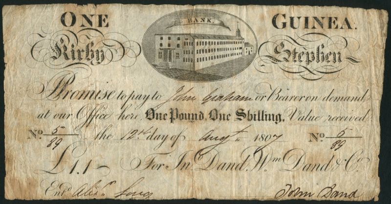 Kirby Stephen Bank (Dand,Dand & Co.), 1 guinea, 12 August 1807, serial number 5/89, black and white, bank building top centre, manuscript signature of John Dand low right