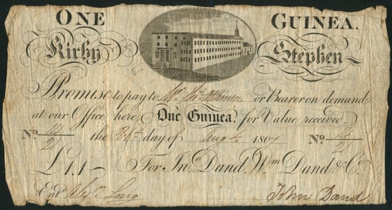 Kirby Stephen Bank (Dand,Dand & Co.), 1 guinea, 21 August 1807, serial number 14/21, black and white, bank building top centre, manuscript signature of John Dand low right, as previous but ONE GUINEA in text as opposed to ONE POUND ONE SHILLING on previous