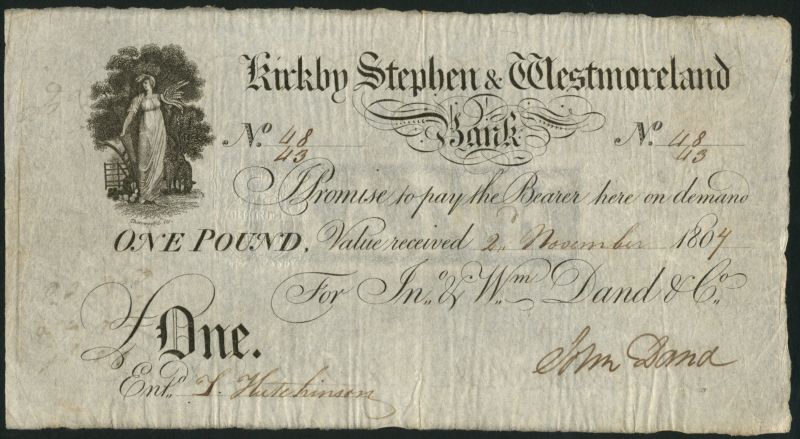 Kirby Stephen & Westmoreland Bank (Jonathan Dand & William Dand & Co.), £1, 2 November 1804, serial nummber 48/43, black and white, allegorical maiden at left with plough, manuscript signature of John Dand low right