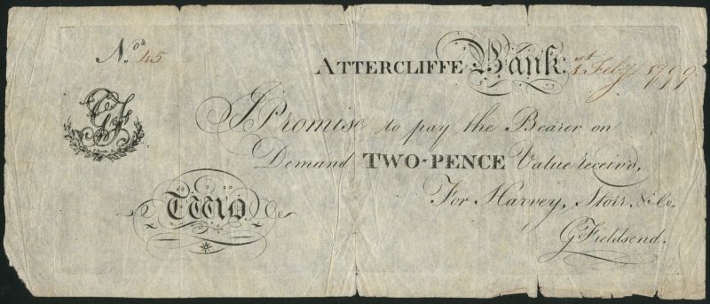 Attercliffe Bank (Harvey, Store & Fieldsend) , a 2 pence skit note dated 1 February 1799, serial number 45, black and white, initials and value at left