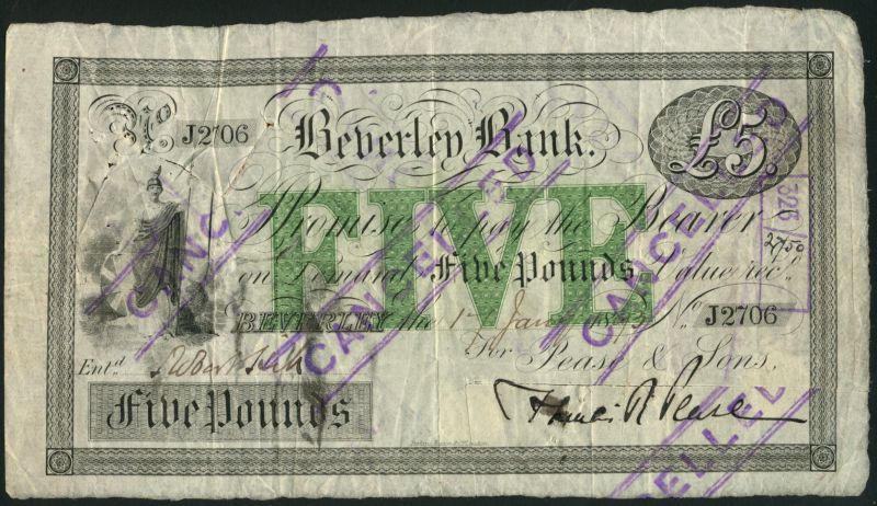 Beverley Bank (Pease & Sons), £5, 1 January 1893, serial number J 2706, black and white with value in green protector at centre, Britannia at left, value in oval frame top right, manuscript signature of francis Pease low right, reverse bank title in green at centre