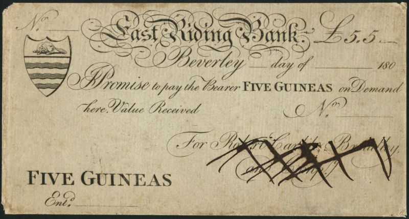 East Riding Bank (Broadlley & Compy.), proof 5 guineas on card, Beverley, 180-, black and white, arms top left