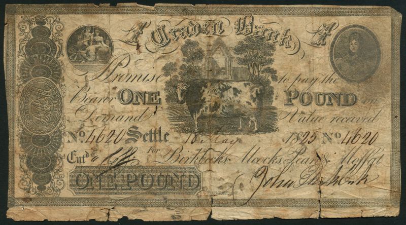 Craven Bank, Settle (Birkbecks, Alcock, Peart & Moffat), £1, 18 May 1825, serial number 4620, black and white, the Craven heifer at centre, ruins behind, manuscript signature of John Peart low right