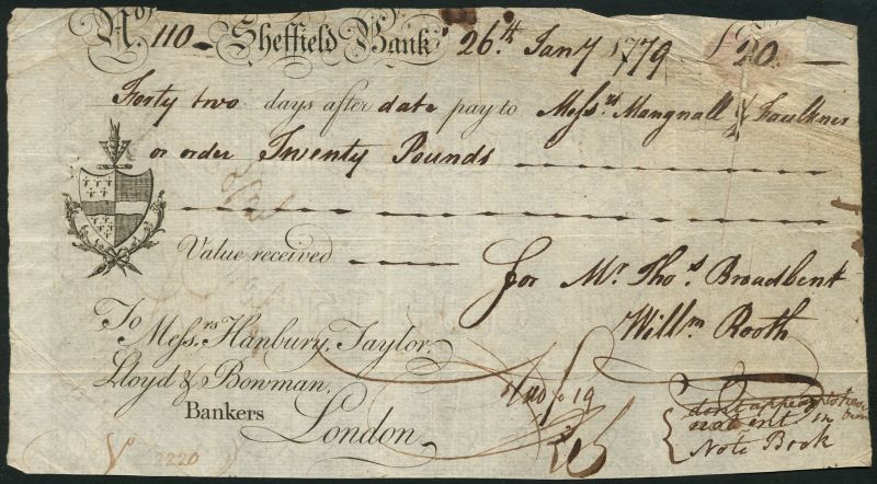 Sheffield Bank (Thomas Broadbent), £20 sight bill, 26 January 1779, serial number 110, black and white, arms top left
