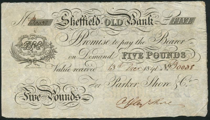 Sheffield Bank (Parker, Shore & Co.), £5, 13 December 1841,serial number B 0038, black and white, partners initials laureate top left, manuscript signature low right