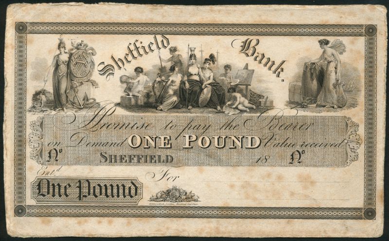 Sheffield Bank, proof £1, 18-, black and white, Britannia and allegorical maidens at top