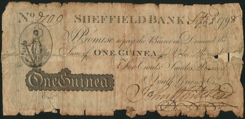 Sheffield Bank (Coats, Smales, Barron, Smith, Green & Co.), 1 guinea, 2 September 1798, serial number M 09, black and white, maiden with anchor at left (Commerce), manuscript signature low right