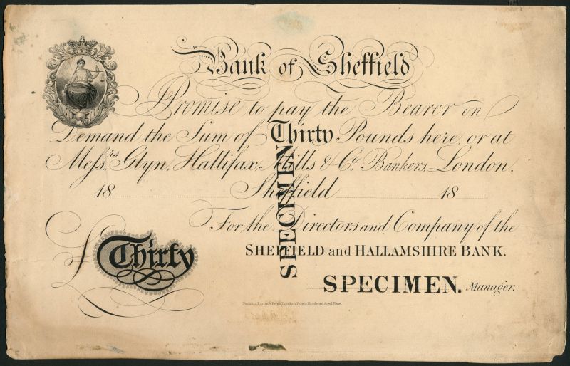 Bank of Sheffield, Sheffield & Hallamshire Bank, unissued £30, 18-, black and white, Justitia seated top left
