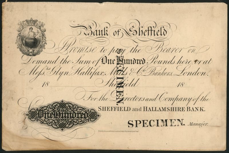 Bank of Sheffield, Sheffield & Hallamshire Bank, proof £100 on card, 18-, black and white, Justitia seated top left