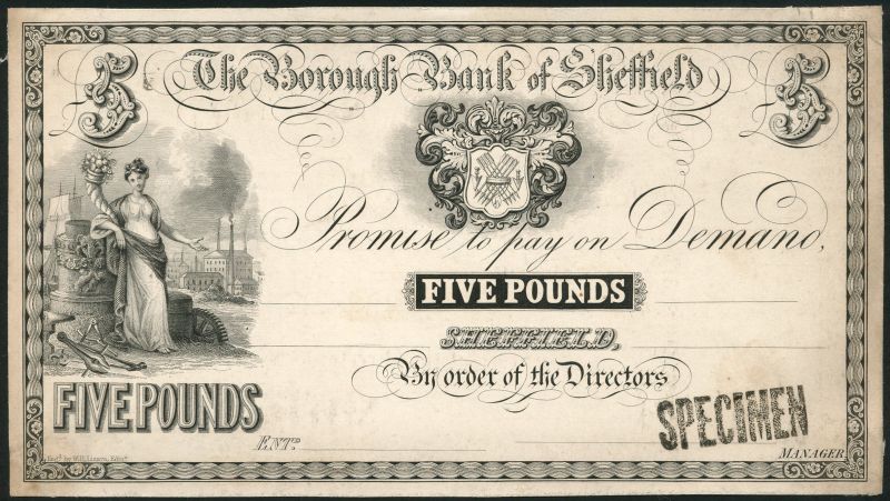 Borough Bank of Sheffield, proof £5 on card, ND, black and white, maiden with corucopia at left (Abundance), arms top centre