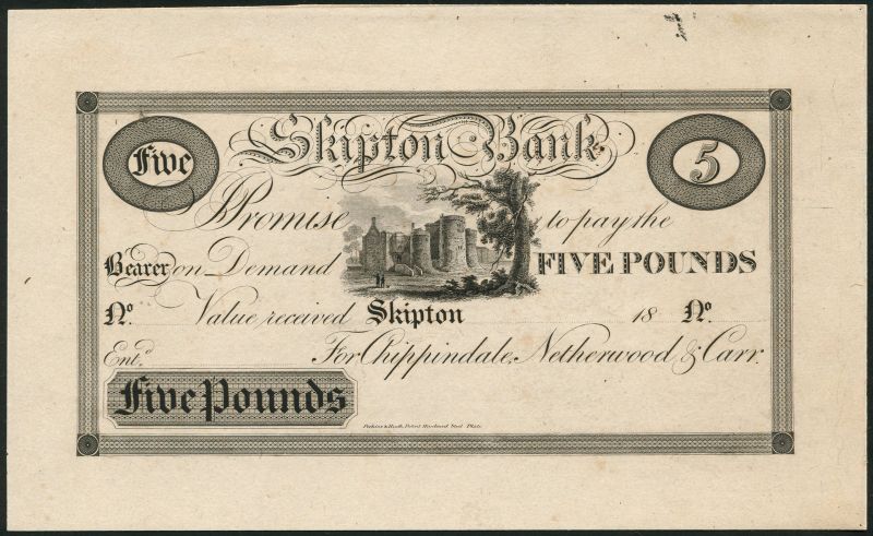 Skipton Bank (Chippindale, Netherwood & Co.), proof £5 on card, 18-, black and white, castle at centre, value in oval top left and right