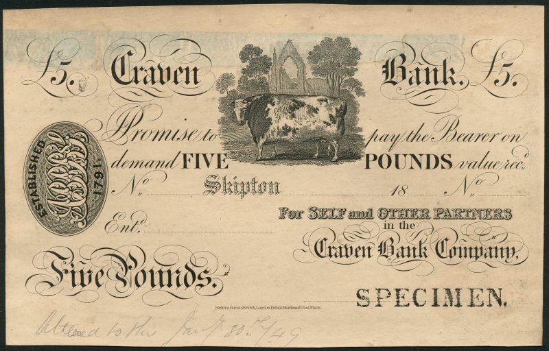 Craven Bank, Craven Banking Company, proof £5 on card, Skipton, 18-, black and white, the Craven heifer at centre, partners initials at left