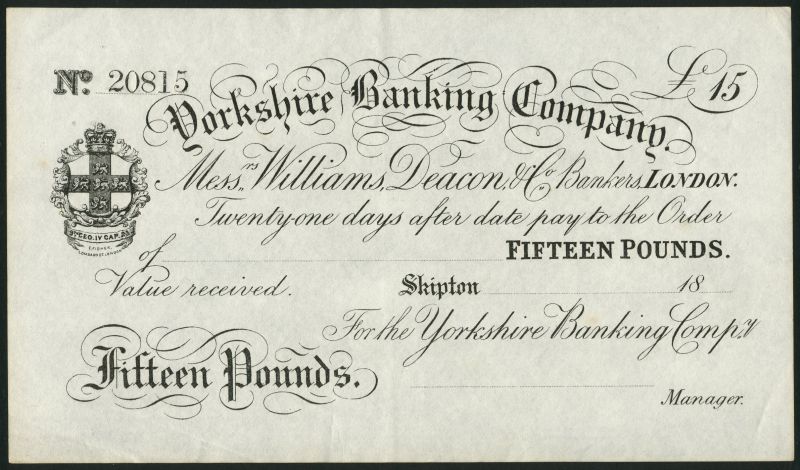 Yorkshire Banking Company, proof/pull for a £15 sight bill, Skipton, 18-, serial number 20815, black and white, arms top left
