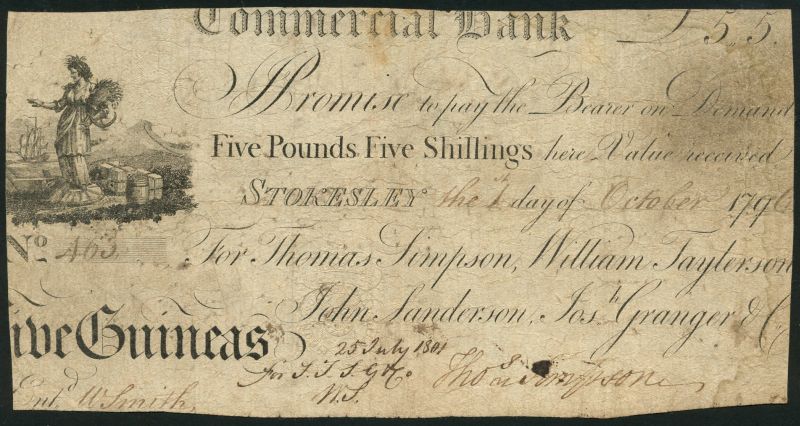 Commercial Bank (Thomas Simpson, William Taylerson, John Sanderson, Josh Granger & Co.), 5 guineas, Stokesley, 1 October 1796, serial number 463, black and white, allegorical maiden at left with corn sheaf and sickle, manuscript signature of Thmas Simpson low right