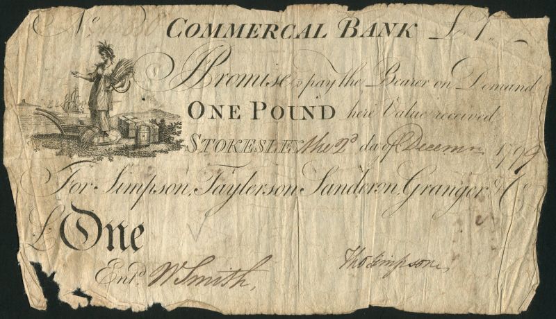 Commercial Bank (Simpson, Taylerson, Sanderson, Granger & Co.), £1, Stokesley, 2 December 1799, serial number Aa 856, black and white, allegorical maiden at left with corn sheaf and sickle, manuscript signature of John Sanderson low right