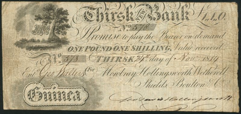 Thirsk New Bank (Mowbray, Hollingsworth,Wetherell,Shields,Boulton & Co.), 1 guinea, 24 November 1814, serial number 578, black and white, arms and oak tree top left, value in pale grey panel low left, manuscript signature of Hollingsworth low right