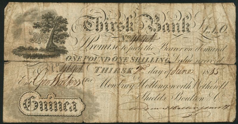 Thirsk Bank (Mowbray, Hollingsworth,Wetherell,Shields,Boulton & Co.), 1 guinea, 2 June 1815, serial number 469A, black and white, arms and oak tree top left, value in pale grey panel low left, manuscript signature of Hollingsworth low right