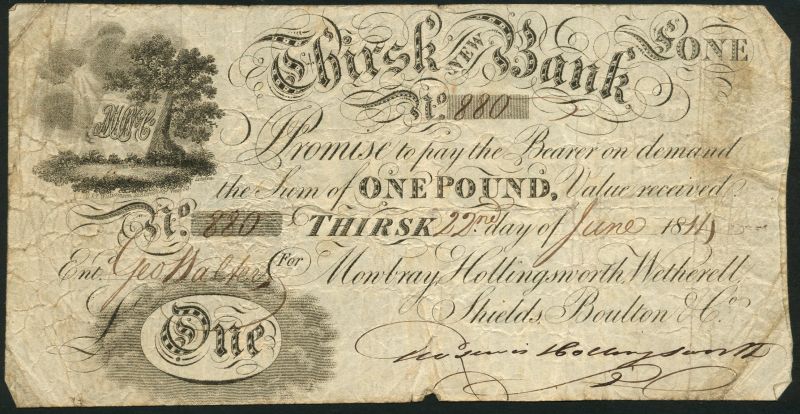 Thirsk New Bank (Mowbray, Hollingsworth,Wetherell,Shields,Boulton & Co.), £1 , 22 June 1814, serial number 880, black and white, arms and oak tree top left, value in pale grey panel low left, manuscript signature of Hollingsworth low right