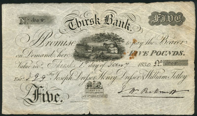 Thirsk Bank (Joseph Dresser, Henry Dresser & William Tetley), £5, 1 January 1830, serial number 3008, black and white, pastoral scene at centre, manuscript signature low right