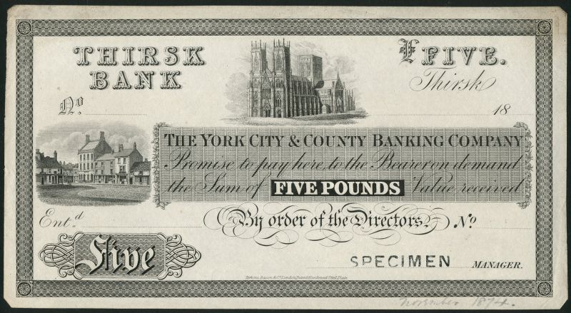 Thirsk Bank, York City & County Banking Company, proof £5 on India paper, Thirsk, 18-, black and white, York Minster top centre, street scene at left
