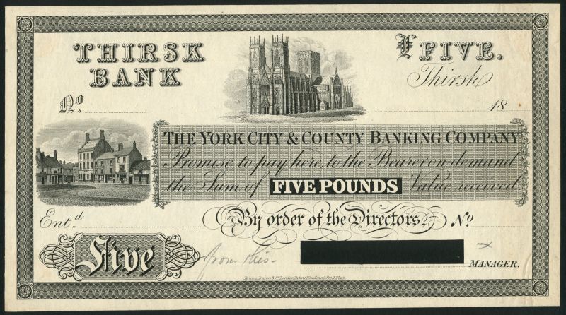 Thirsk Bank, York City & County Banking Company, proof £5 on India paper, Thirsk, 18-, black and white, York Minster top centre, street scene at left