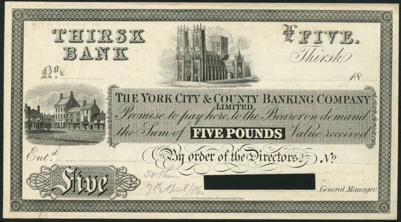Thirsk Bank, York City & County Banking Company Limited, proof £5 on India paper, Thirsk, 18-, black and white, York Minster top centre, street scene at left