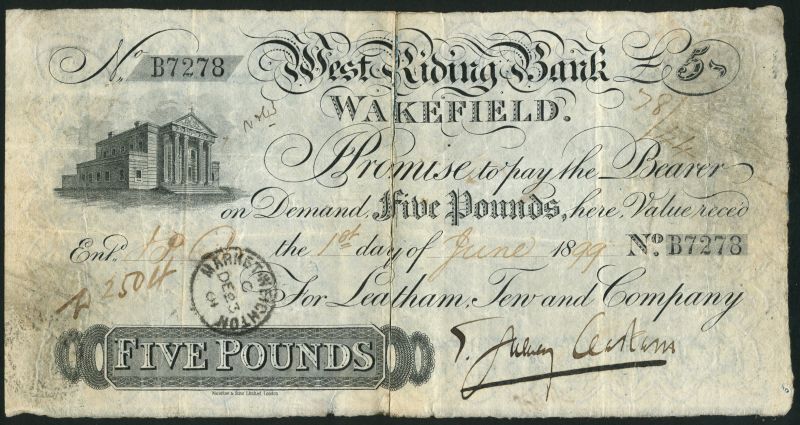 West Riding Bank, Wakefield (Leatham, Tew & Compy.), £5, 1 June 1899, serial number B 7278, black and white, bank building top left, manuscript signature of John Leatham low right, reverse blue, also a letter from Barclays Bank stating that the note is still outstanding !