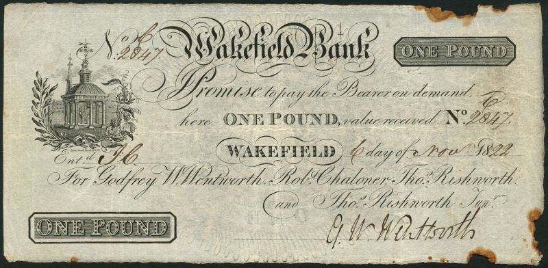 Wakefield Bank (Godfrey W. Wentworth, Robt Chaloner, Thos Rishworth and Thos Rishworth Junr), £1, 6 November 1822, serial number 2847, black and white, monument top left, manuscript signature of Godfrey Wentworth low right