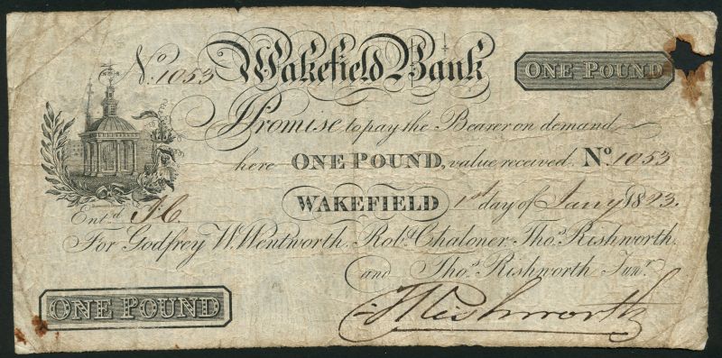 Wakefield Bank (Godfrey W. Wentworth, Robt Chaloner, Thos Rishworth and Thos Rishworth Junr), £1, 1 January 1823, serial number 1053, black and white, monument top left, manuscript signature of Rishworth low right