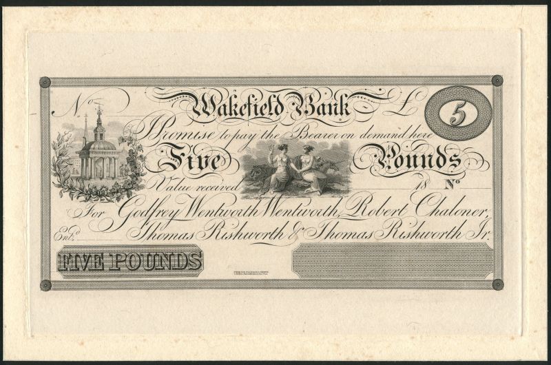 Wakefield Bank (Godfrey W. Wentworth, Robt Chaloner, Thos Rishworth and Thos Rishworth Junr), proof £5, 18-, bck and white, monument top left, allegorical maidens at centre with lion and unicorn