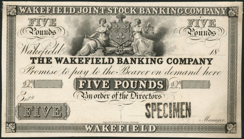 Wakefield Joint Stock Banking Company, proof £5 on card, 18-, black and white, arms flanked by allegorical maidens top centre, reverse black and white, Abundance at left, Britannia at right