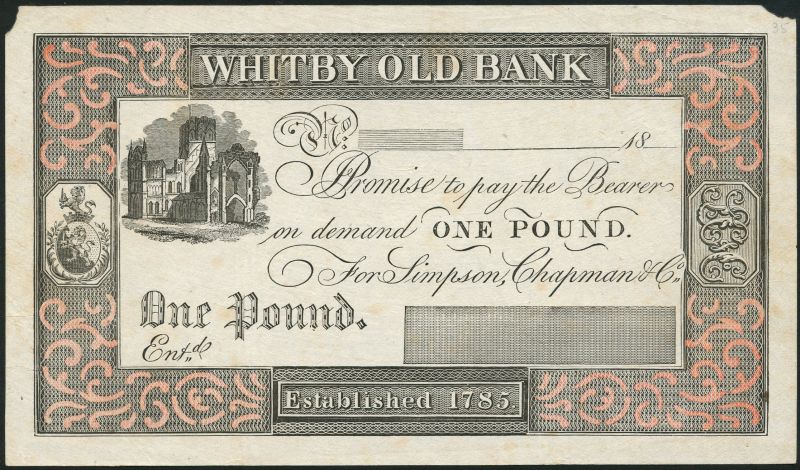 Whitby Old Bank (Simpson, Chapman & Co.), unissued £1 (2), 18-, black, white and red, ruins top left and arms at left