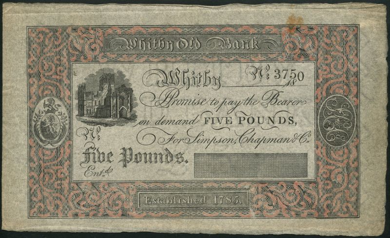 Whitby Old Bank (Simpson, Chapman & Co.), unissued £5 (2), 18-, one with serial number 3750, black, white and red, ruins top left, arms at left, partners initials at right